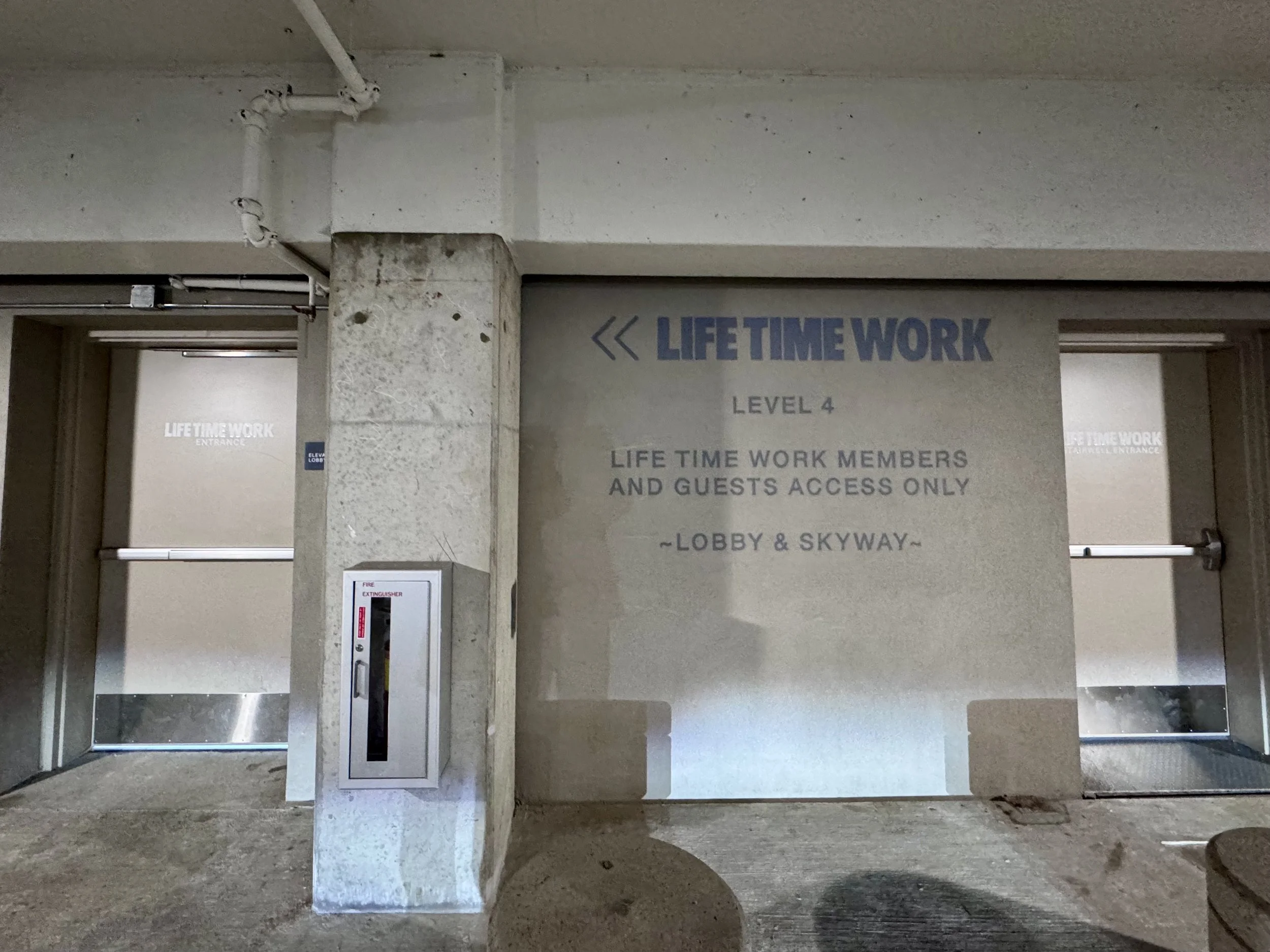 You will see dark gray-colored signage for Life Time Work next to the lobby door (see pictures below). Ignore the key fob entry, doors are open from 8:30am-5pm Monday through Friday. Take either elevator located on the back left-hand side of the parking structure. Go to the 4th floor and enter the beautiful lobby, pictured above.